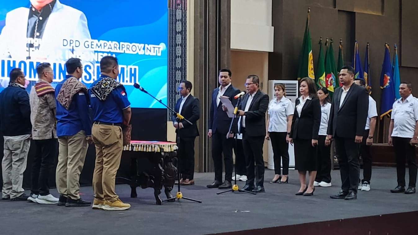 Ketua Umum GEMPAR Indonesia DPD NTT, Yosef Lede saat membacakan ikrar saat prosesi pelantikan, Jumat sore, 14 November 2025 di Aula El Tari Kupang. Foto: Gorby Rumung/ExpoNTT